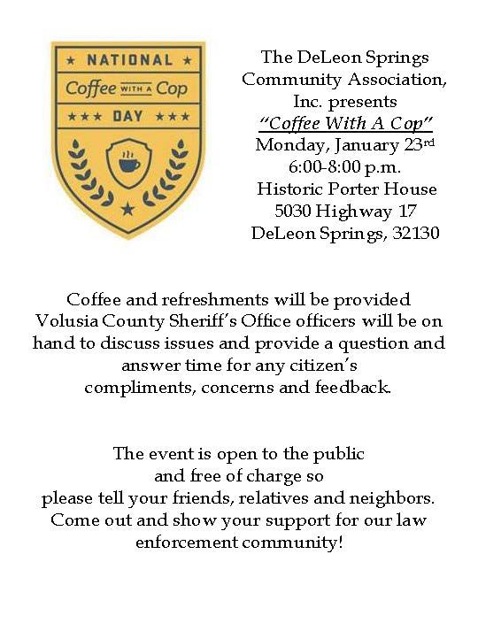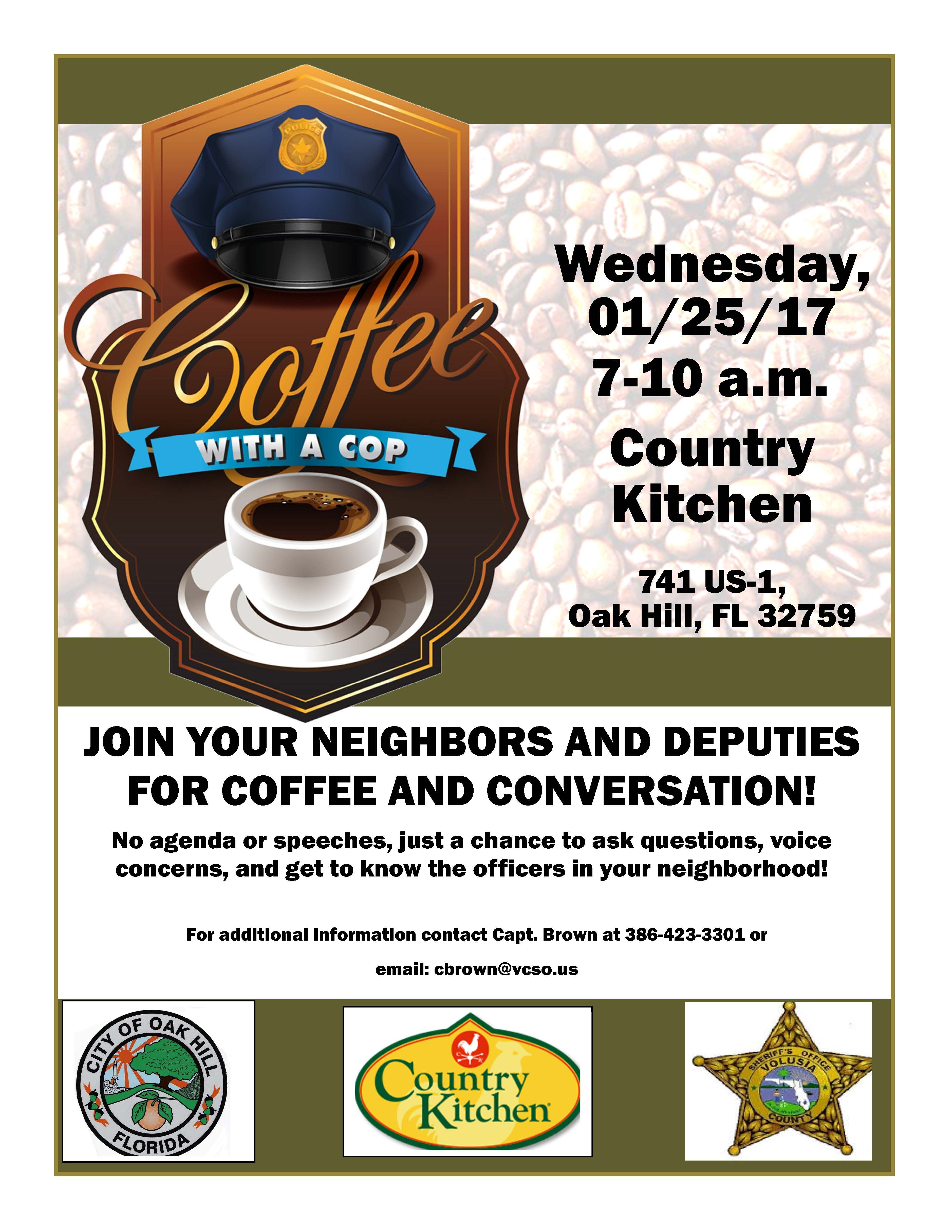 Next week, residents will have two opportunities to provide their feedback to deputies in a relaxed and informal setting designed to maintain open lines of communication and foster a greater understanding between the citizens and police. It’s called Coffee With A Cop, and the Sheriff’s Office will be hosting events on Monday in DeLeon Springs and Wednesday in Oak Hill. For law enforcement, it’s a way to connect with the community, answer questions and hear first-hand from residents about public safety issues. It’s also part of a five-point pledge -- including a pledge to community engagement -- that Sheriff Chitwood rolled out before taking office. The pledge to community engagement includes interacting with all of the diverse facets of the county, building community trust and working to evaluate and meet the needs of the public. “Block by block, neighborhood by neighborhood, city by city, we’re going to improve the quality of life of our residents -- with residents at the table, telling us how they want us to do it…..,” Sheriff Chitwood said during his Jan. 3 swearing-in ceremony.